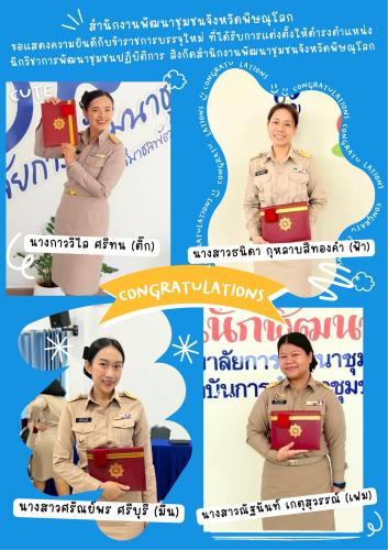 ทั้งนี้ พัฒนาการจังหวัดพิษณุโลก พร้อมด้วยผู้อำนวยการกลุ่มงานทุกกลุ่มงาน และทีมงานสำนักงานพัฒนาชุมชนจังหวัดพิษณุโลก ได้ร่วมแสดงความยินดีกับข้าราชการบรรจุใหม่ที่ได้รับการแต่งตั้งให้ดำรงตำแหน่งในสังกัดสำนักงานพัฒนาชุมชนจังหวัดพิษณุโลกอย่างอบอุ่น