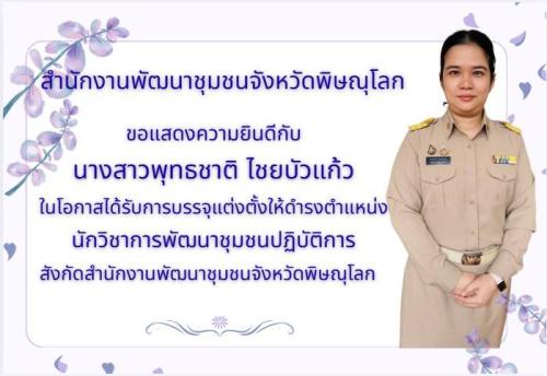 นายชัยพร เขิมขันธ์ พัฒนาการจังหวัดพิษณุโลก พร้อมด้วยผู้อำนวยการกลุ่มงานทุกกลุ่มงาน และบุคลากรในสังกัด ร่วมแสดงความยินดีกับข้าราชการบรรจุใหม่ (พัฒนากรรุ่น 134) ราย นางสาวพุทธชาติ ไชยบัวแก้ว ในโอกาสได้รับบรรจุแต่งตั้งให้ดำรงตำแหน่งนักวิชาการพัฒนาชุมชนปฏิบัติการ สังกัดสำนักงานพัฒนาชุมชนจังหวัดพิษณุโลก